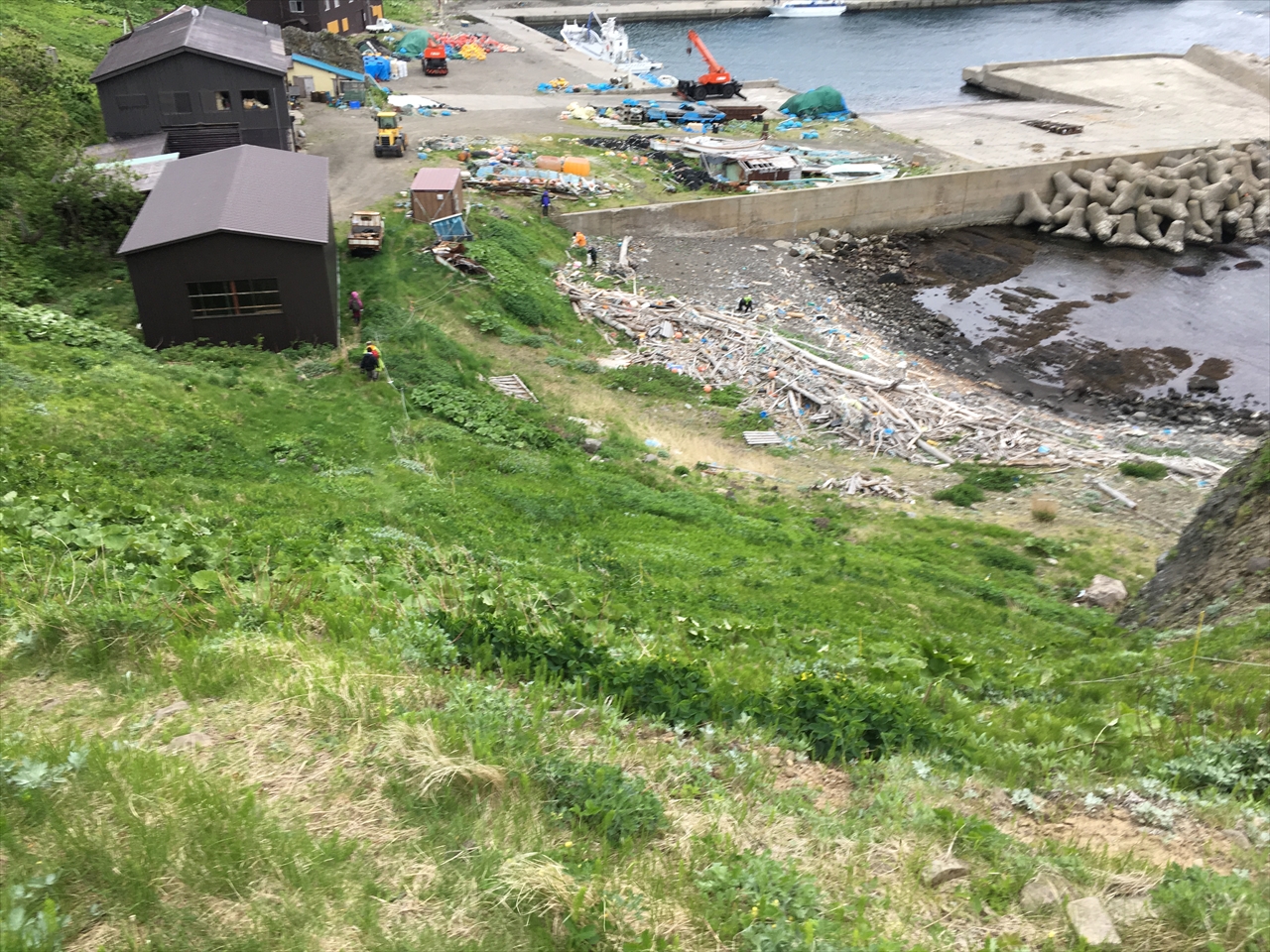 桟橋など施設があるすぐ横の弧を描いたエリアは、隙間ないくらい漂着物で埋まっていた。流木はいずれ自然にかえるものなので回収優先順位は低いが、今も漁業で利用されている港の隣接区域ということもあり、ロープをはじめとする漁具のゴミが多かった。