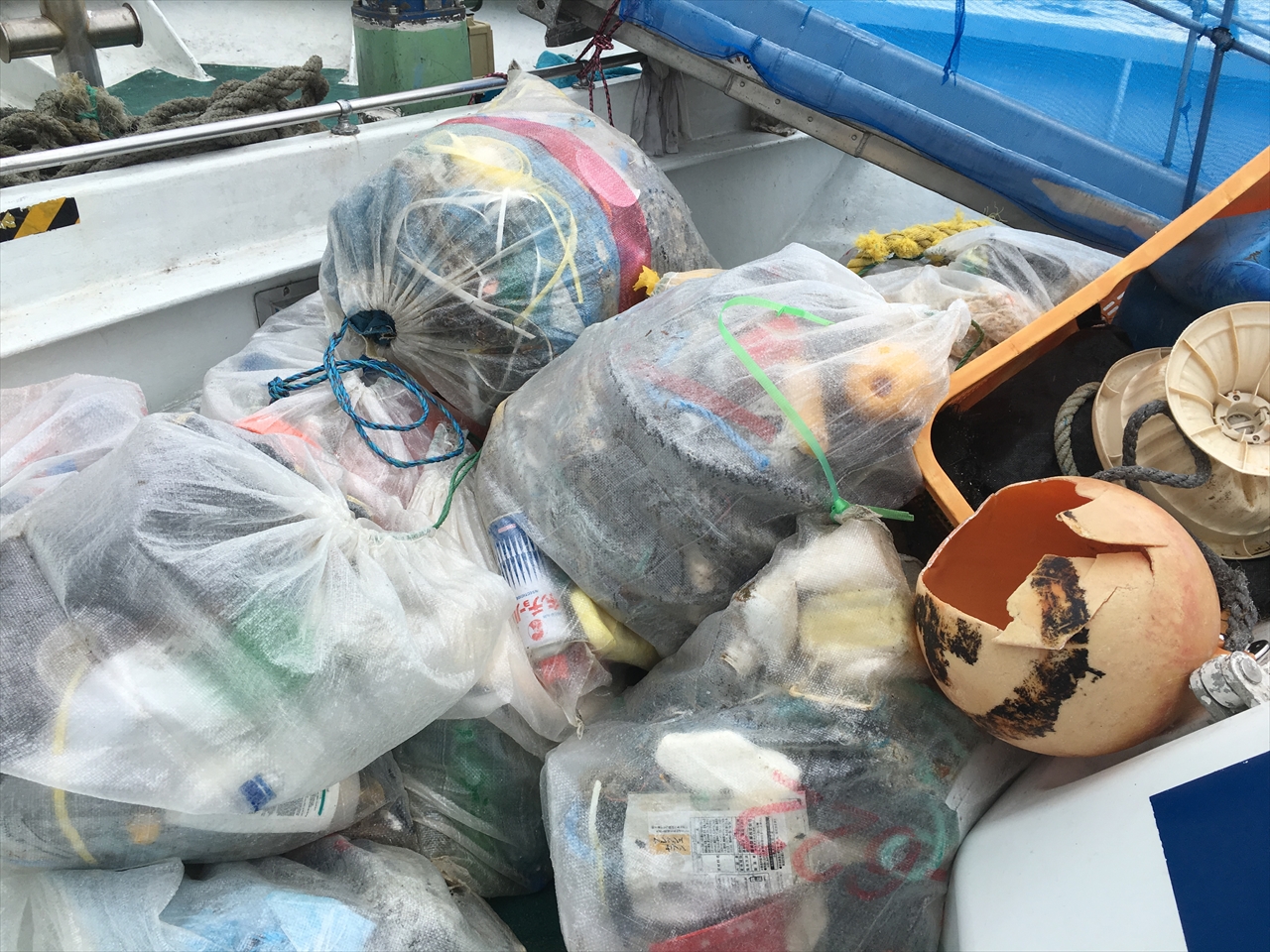 台風などで養殖の網が流されてしまったりして発生することも多いそう。ただ回収しなければこうしてどんどん溜っていってしまう。