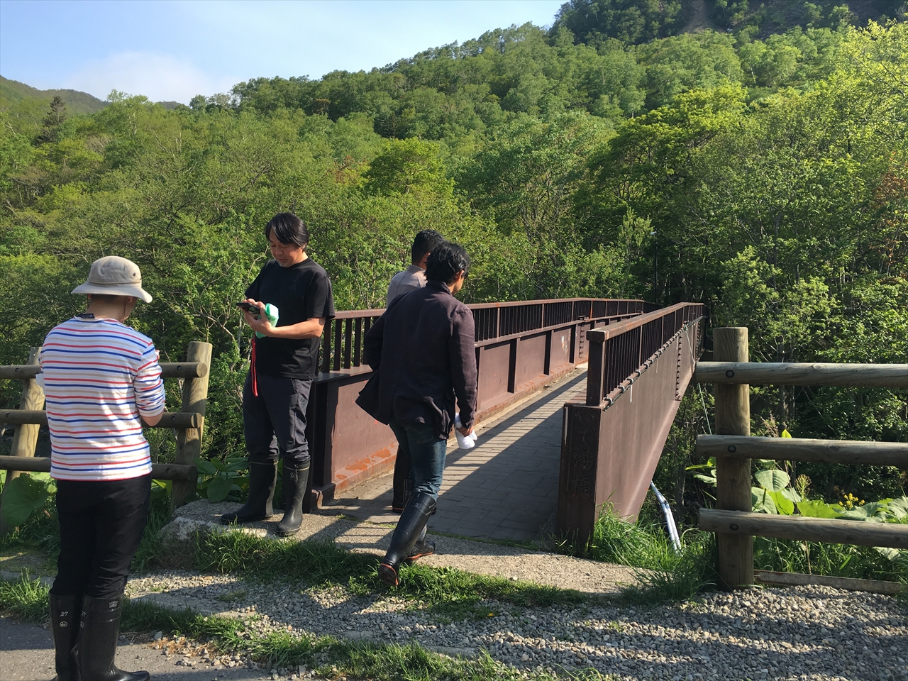 羅臼川沿いに車を停め、橋を渡って対岸に。