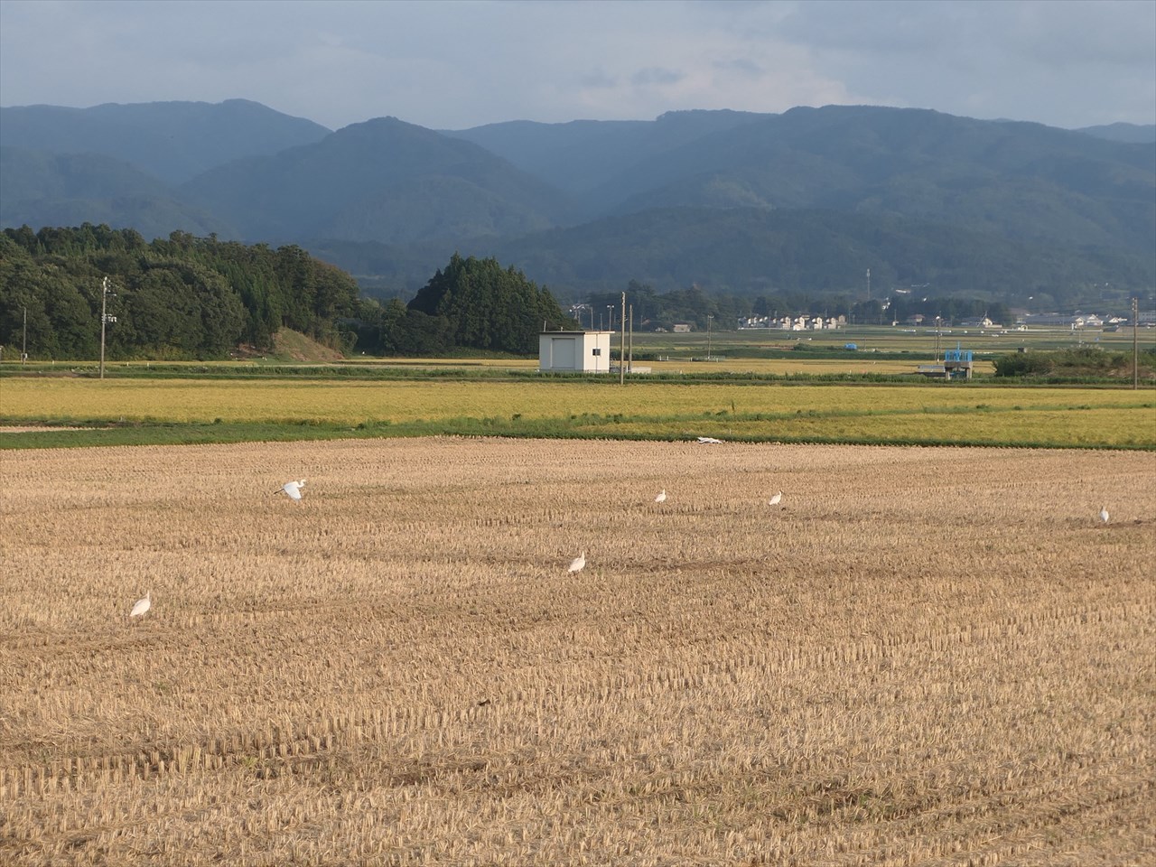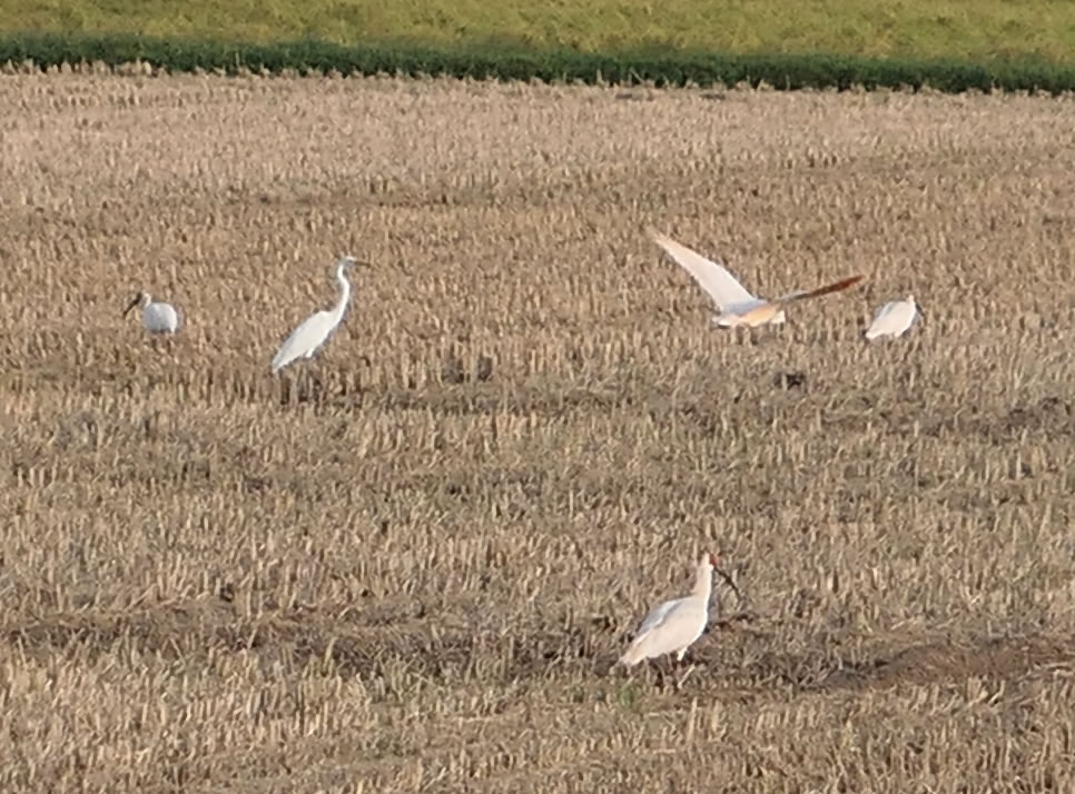 そうそう、バス移動中に刈り取った直後の田んぼでサギたちに混じっているトキもみたよ!