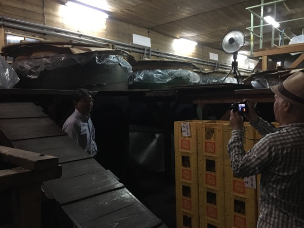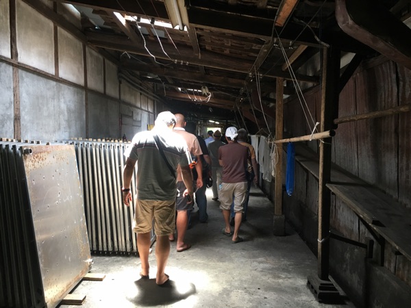 そんな状況の中、蔵見学スタート。入口で靴を脱ぎ、スリッパに履き替えて建物に入ってゆく。