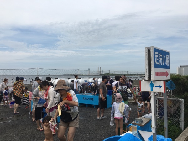 最後に、水槽で貝を洗い、手足もきれいに洗って終了。