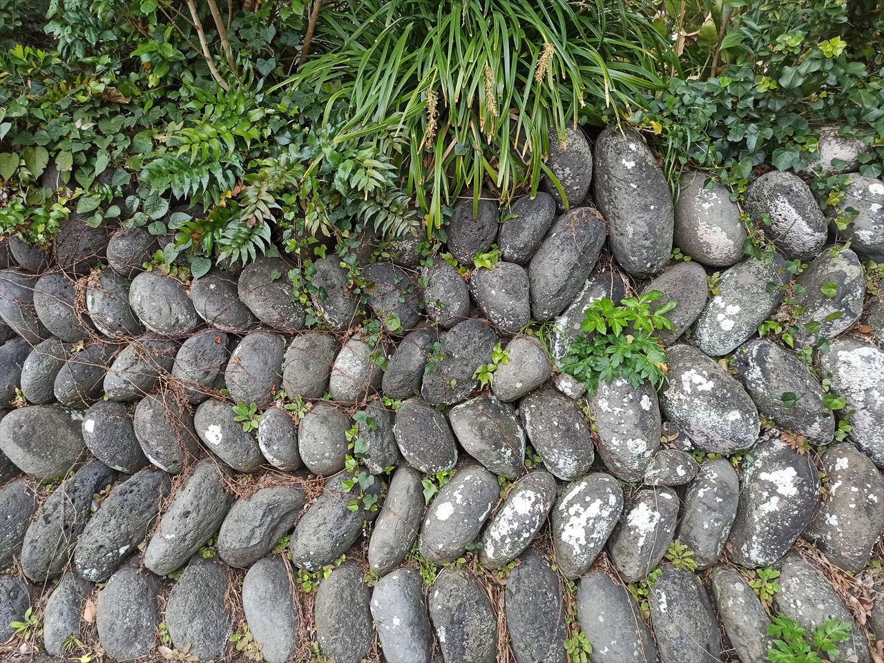丸みを帯びた医師がこんな風にびっしり積み上げられている。八丈島ではこの玉石の塀が人気の観光スポットとなっているが、利島では至る所で見られる。