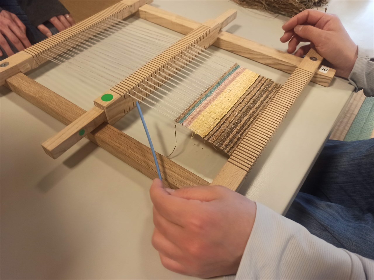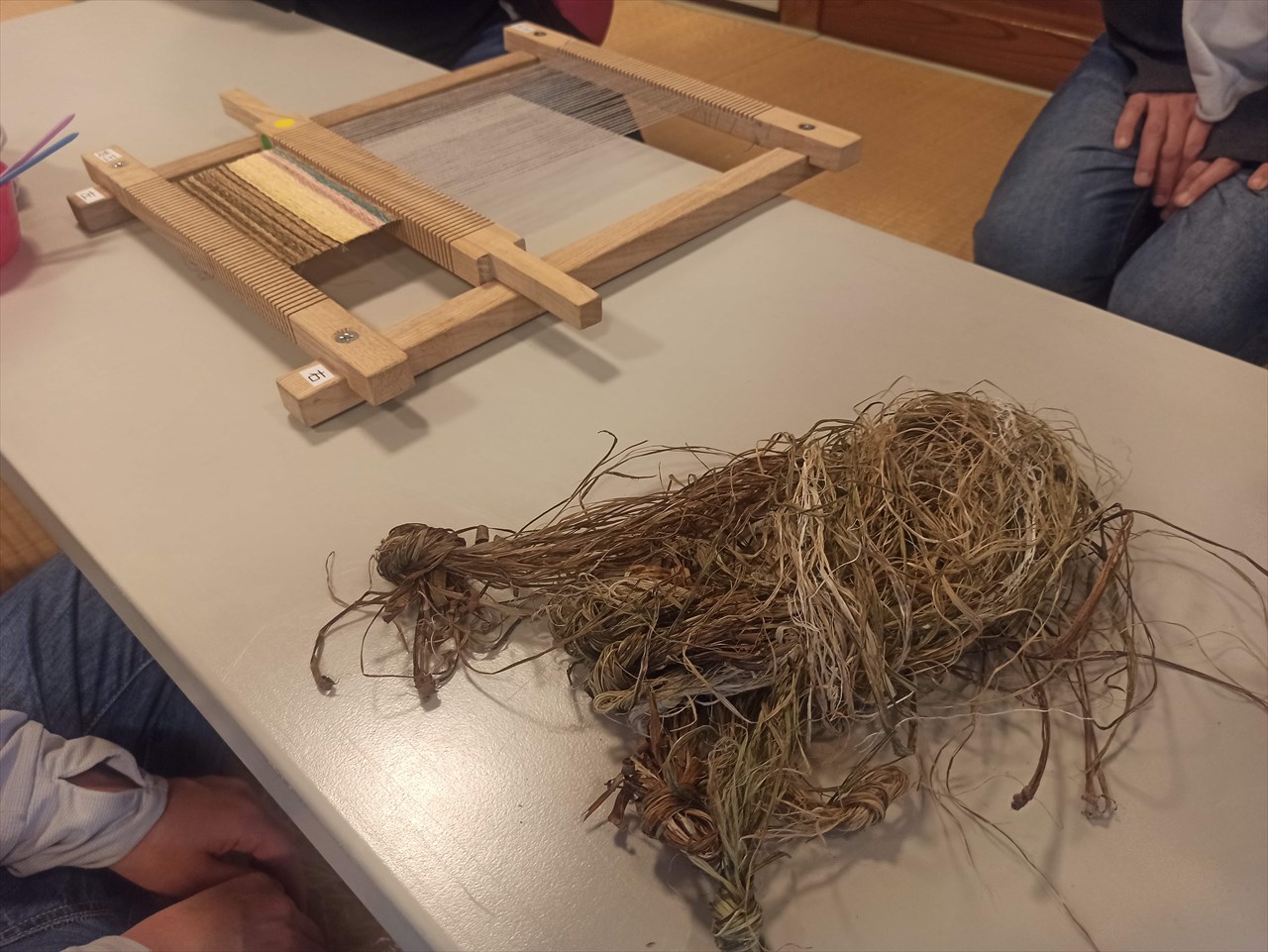 畳の部屋では、織物を教え教わっている女性二人の姿。