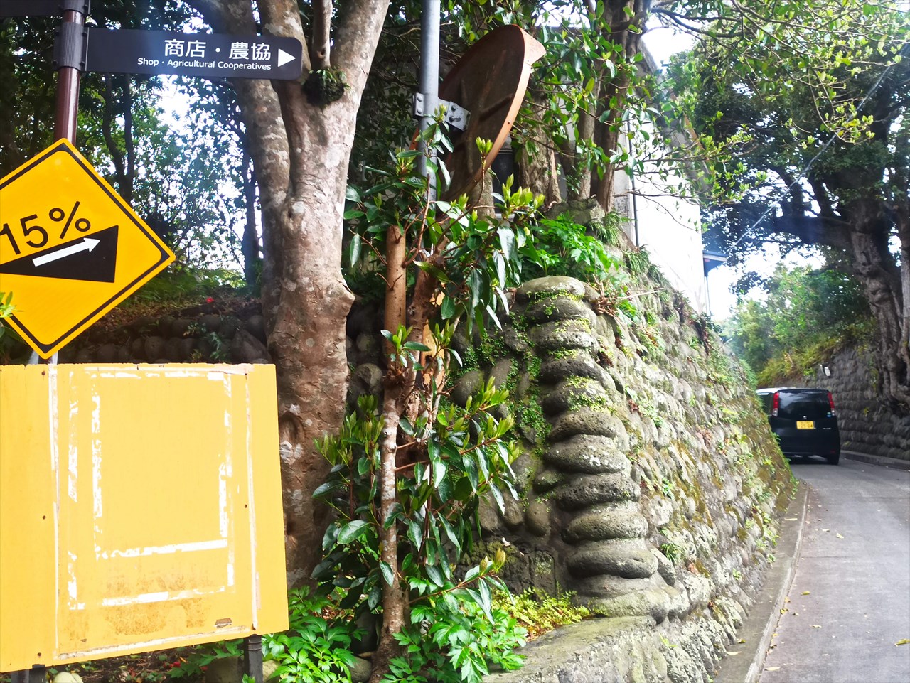 斜面だらけの場所に建物を建てる時には、土を運び込んで平地を作る。それで道の両脇は石垣だらけとなる。