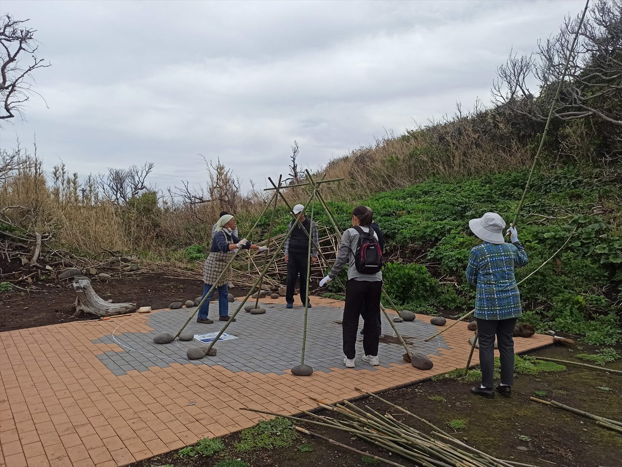そのすぐ近くには「遺跡の丘」と名がつけられた場所があり、この日は東京から大学の先生が来島し、島の方々と一緒に実際に竪穴式住居を作ってみるというイベントが開催されていた。