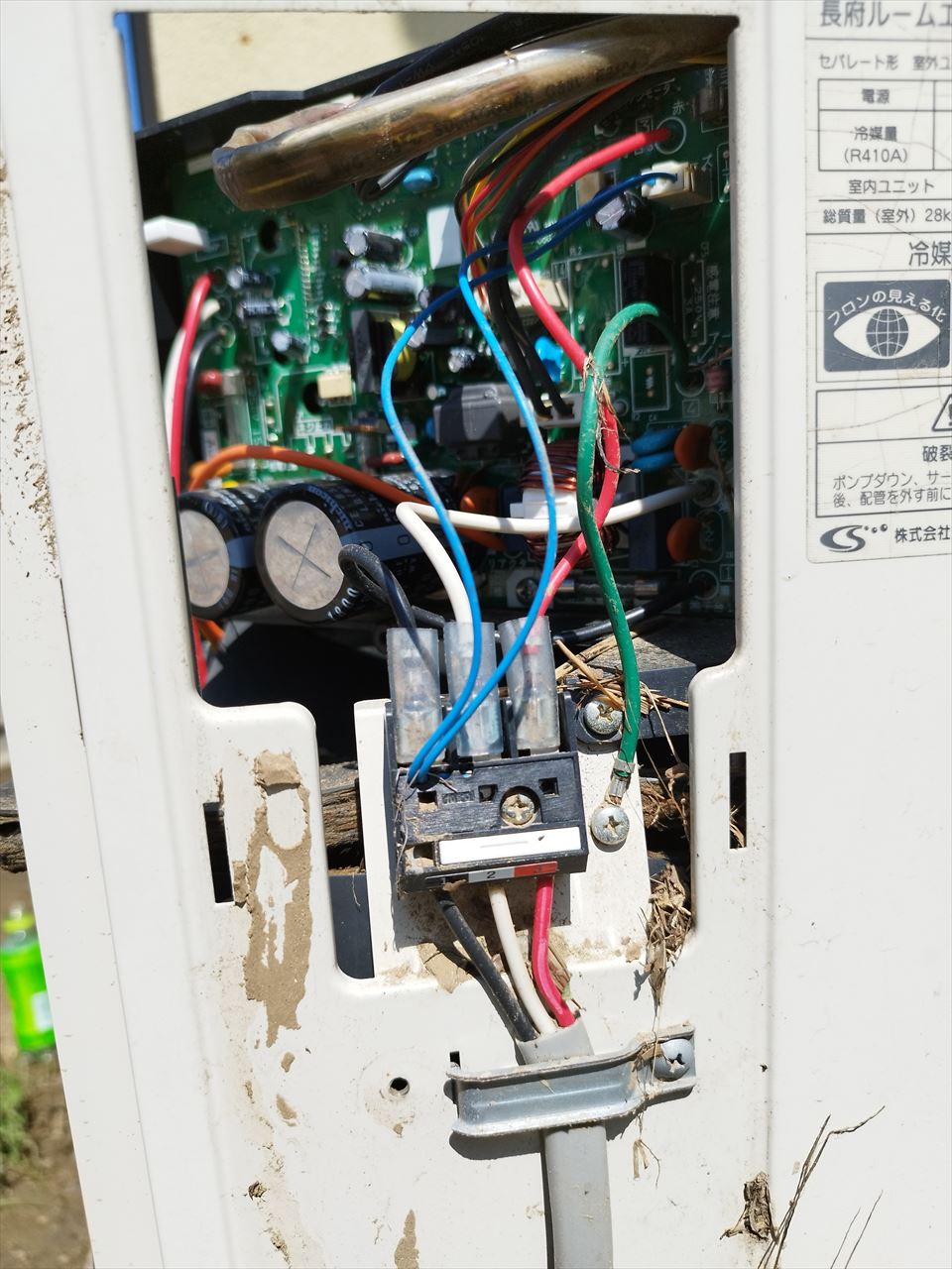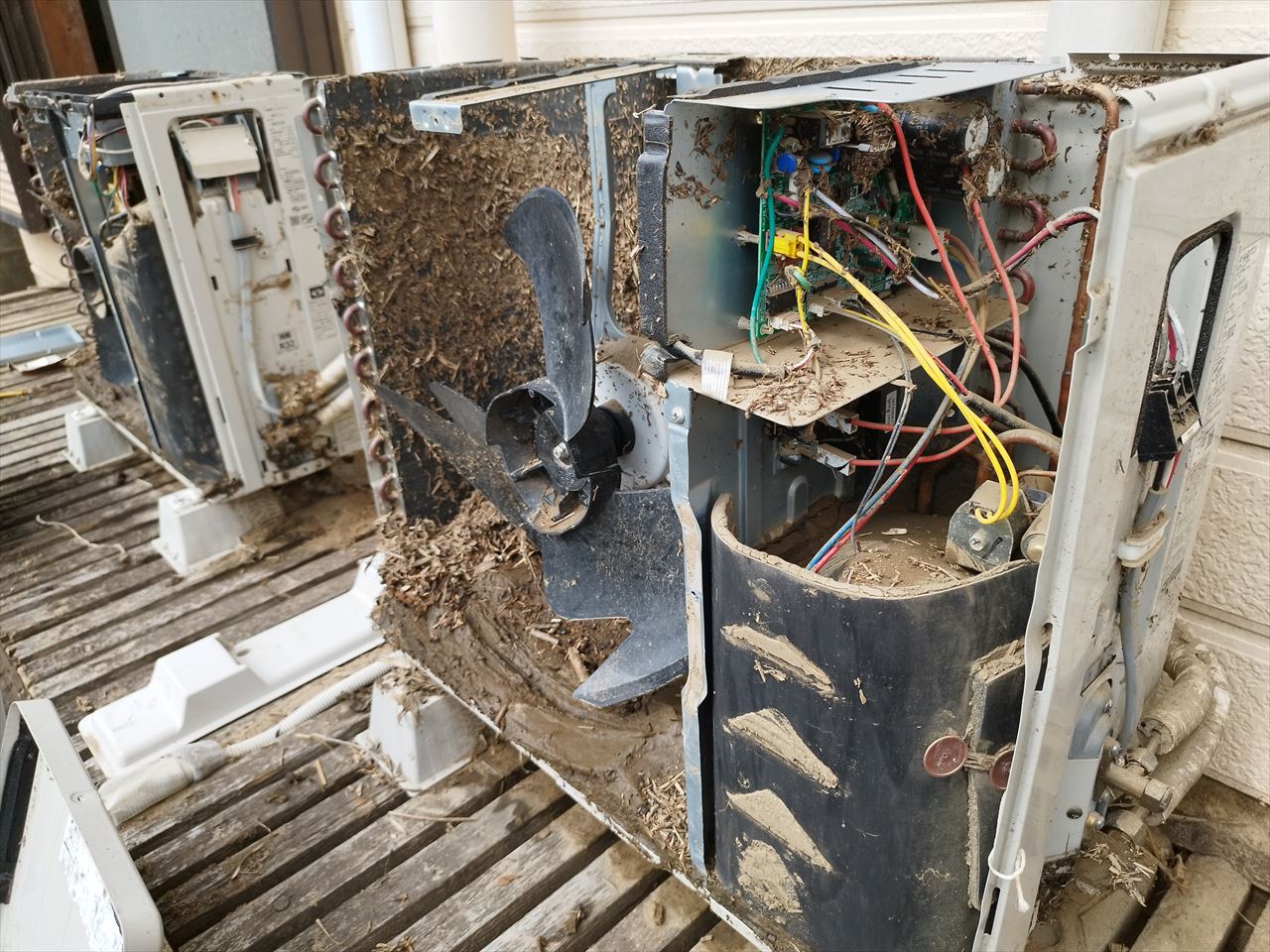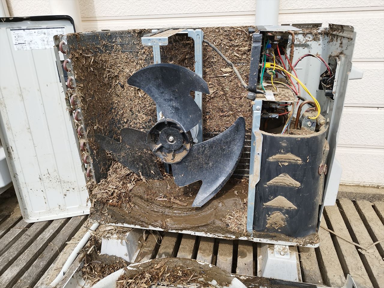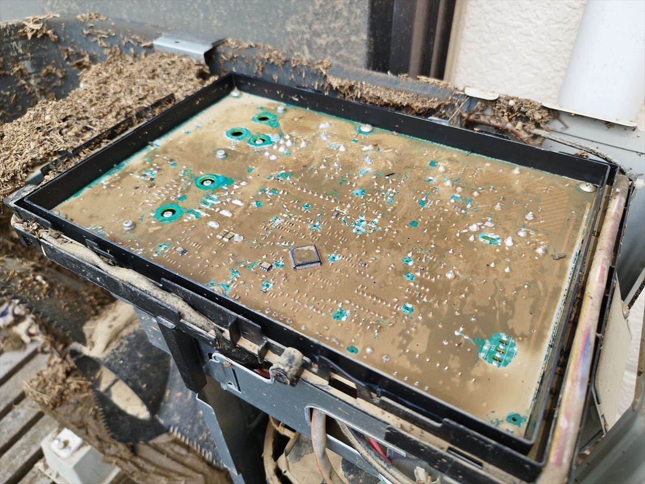 見てお分かりの通り、左側のファンの下にはたっぷり泥が堆積し、背面のフィルターにも藁状のものがびっしり。そして右上の基板も泥まみれになっており、室外機の中でもっとも重要な役割を果たすコンデンサー(圧縮機)がある右下の防音カバーの中は泥がぎっしり詰まっている。