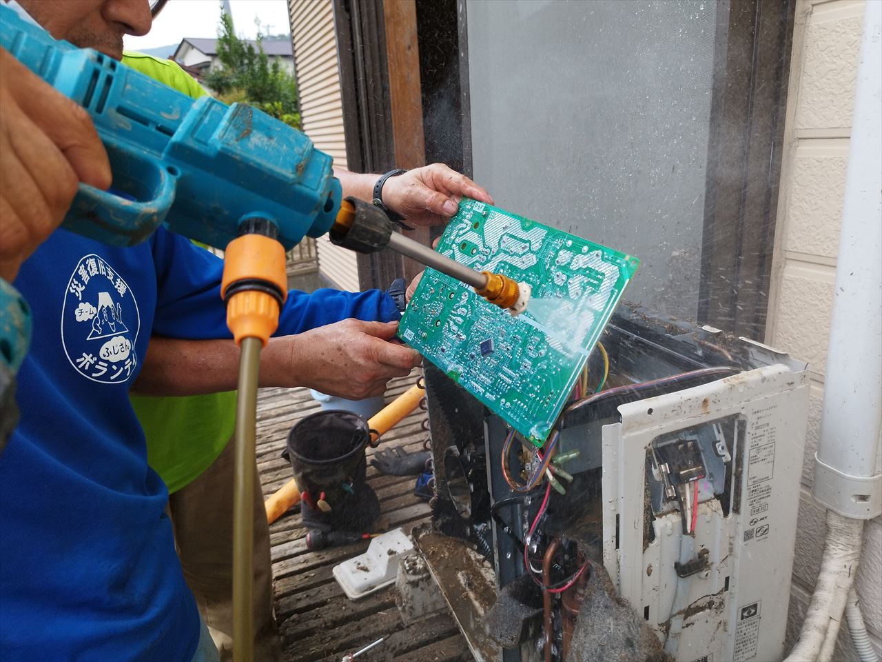 水没したエアコン室外機を洗浄し、もう一度使えるようにしてくれる凄腕技術系ボランティアの「ふじさん」こと藤野さんに、OJTでその方法を教えてもらうためだ。そして・・・