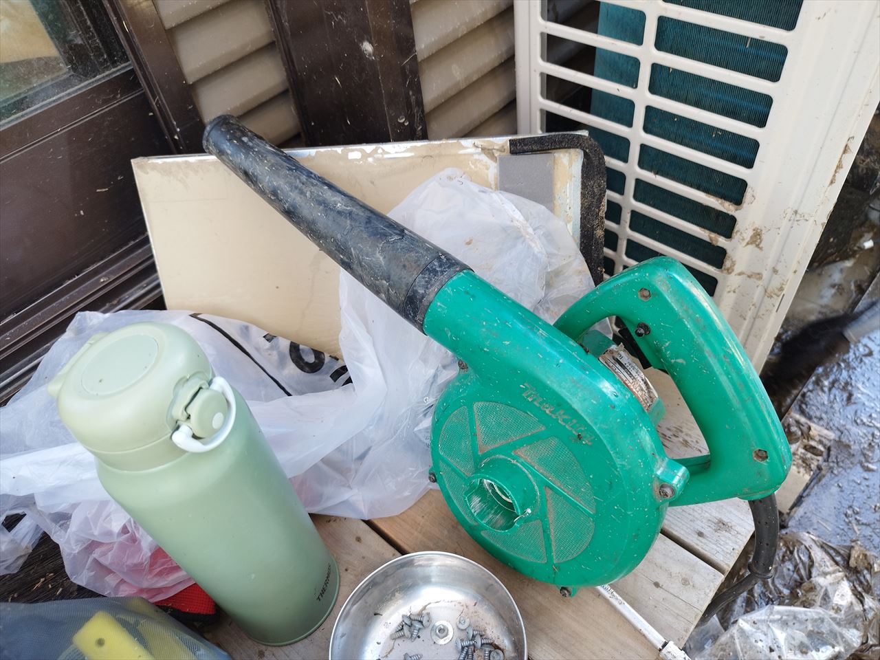 さらに反対側にあった、もっと激しく泥が詰まった古いエアコン室外機も動き出した。