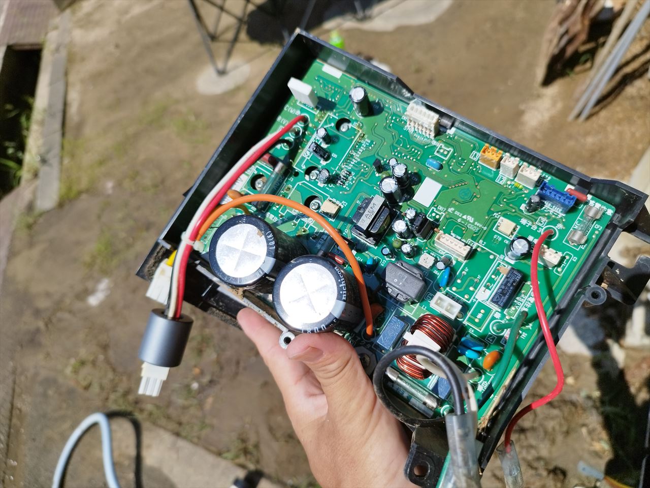 家主さんに聞いたところ、水害の後、カバーを外して基板に水をかけて洗い、その後スイッチを入れてみたんだけど動かなかったとのこと。