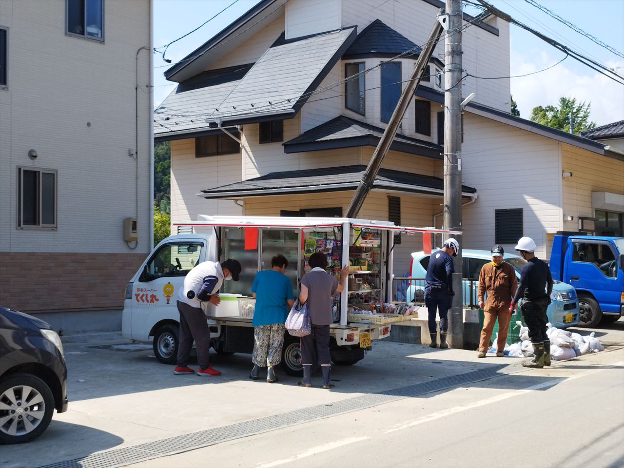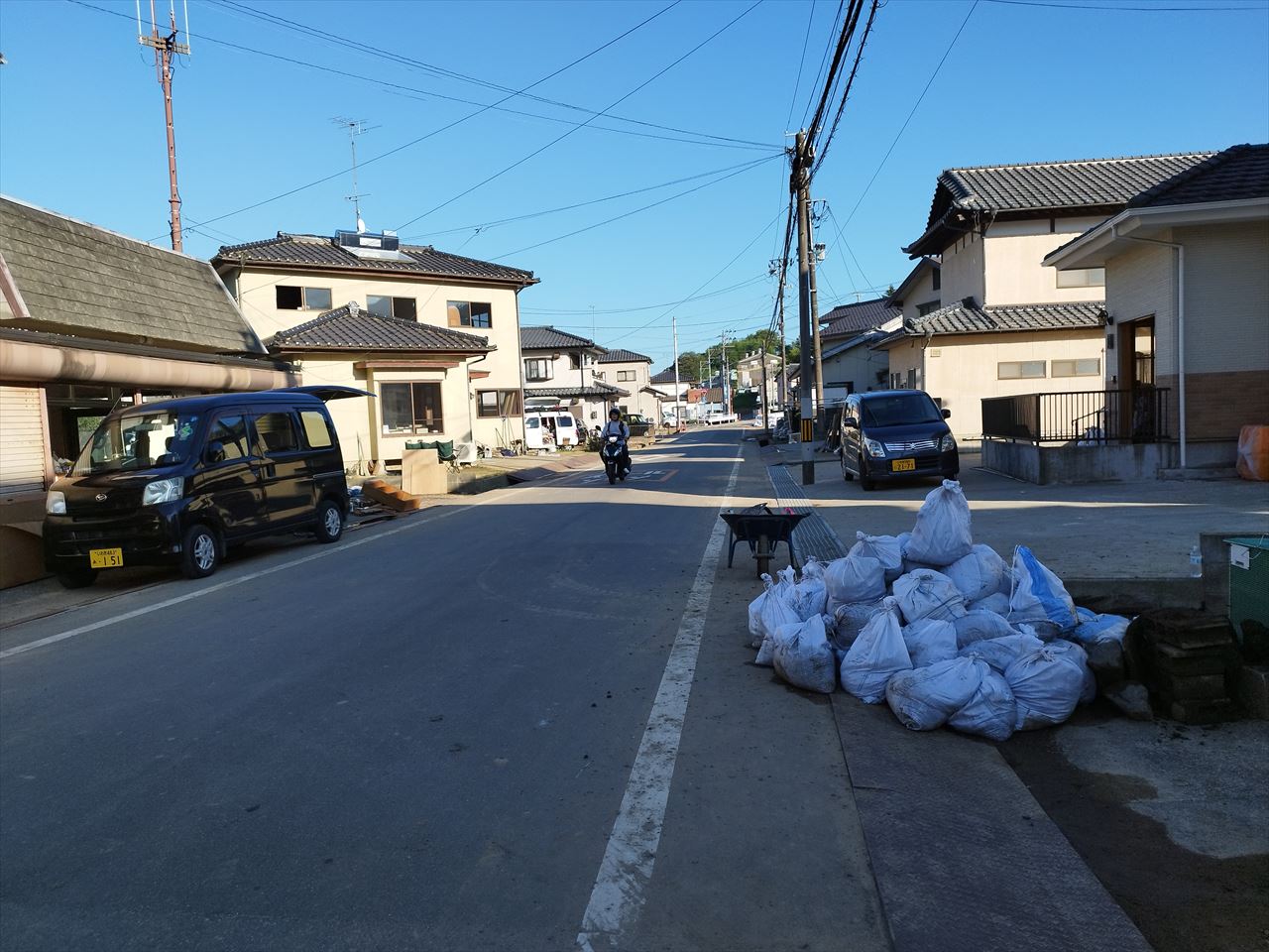 これは2日目に撮った写真で、これだとちょっとわかりにくいが、左右両側どの家も床上浸水で床下にびっしり泥が入り、床板を外しての泥出し作業が進行中。3連休で県内外からもたくさんのボランティアが集まっていたが、それ以上に被害甚大な家屋が多く、大半の家は家族や親戚で汗だくになりながら重たい労働をしていた。