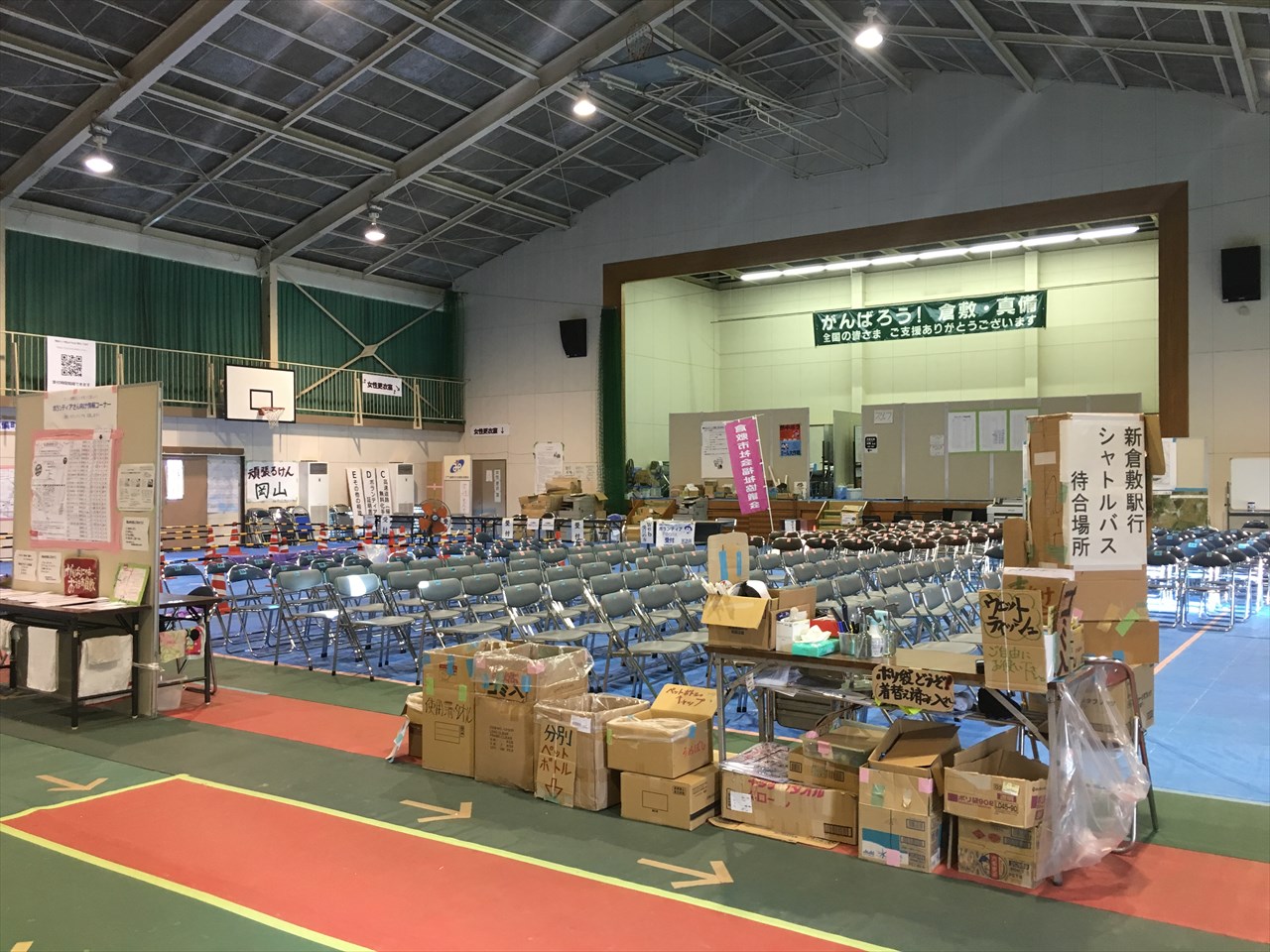 倉敷市は、真備町を中心とした浸水被害があまりにも広範囲にわたってしまい、特に初期には搬出された家具類で道が通れなくなってしまったこともあり、災害ボランティアセンターが現地からかなり離れた場所に作られた。