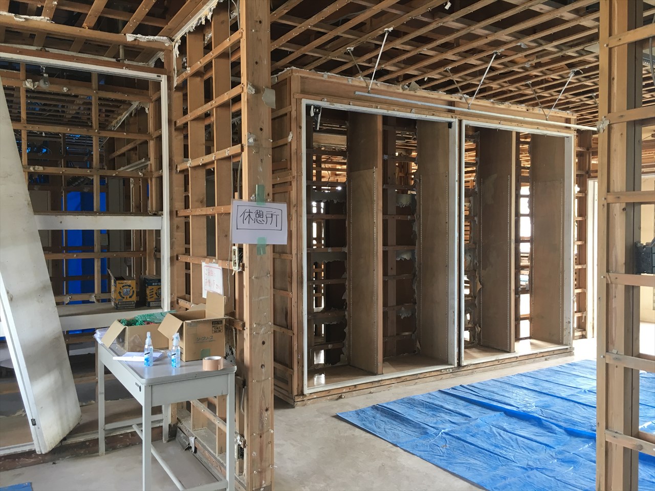 中は壁板や断熱材、天井板まですべて剥がしこの状態。