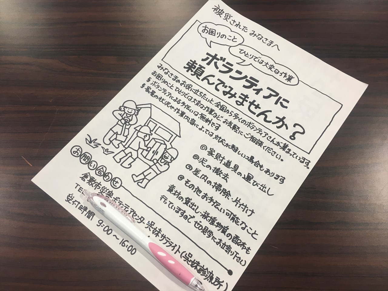 地区の被災家屋をまわっていると、ボランティアに頼んでくれたらすぐに片づけられるのにと思う家屋も結構あり、ただ住民は週末にしかやってこないところも多いので、こうしたちらしを投げ込んでおけば必要な人には伝わる。