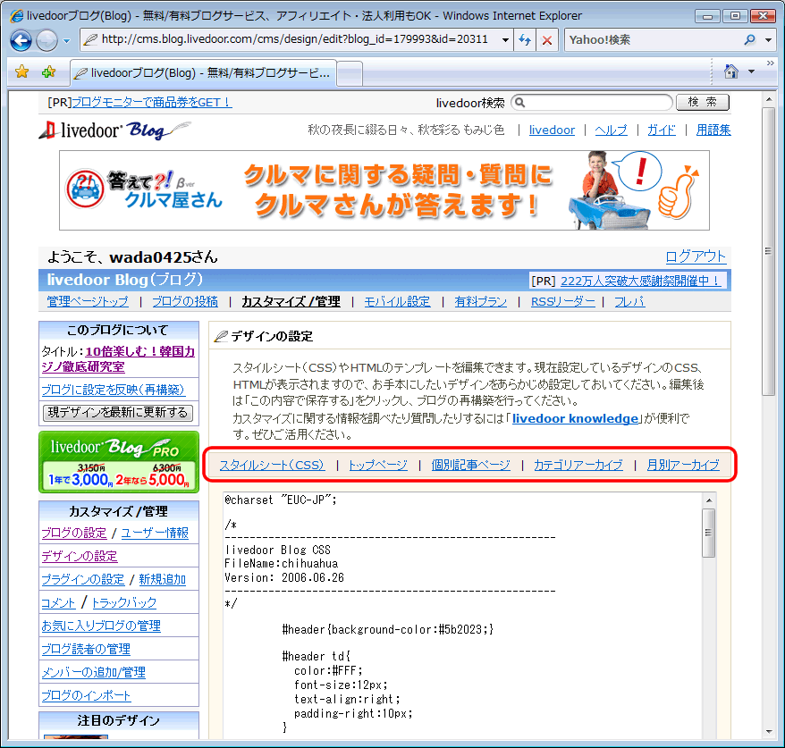 もし、「ブログタイトル」や「ブログ説明文」の文字色などを変更したい場合には、同じくスタイルシート(CSS)を編集する。