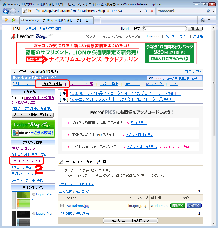 「ブログの投稿」>「ファイルのアップロード」